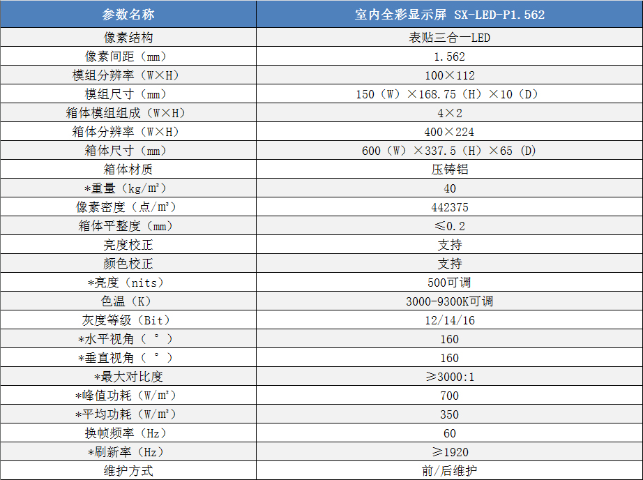 P1.562室內(nèi)小間距高清全彩LED顯示屏技術(shù)參數(shù):