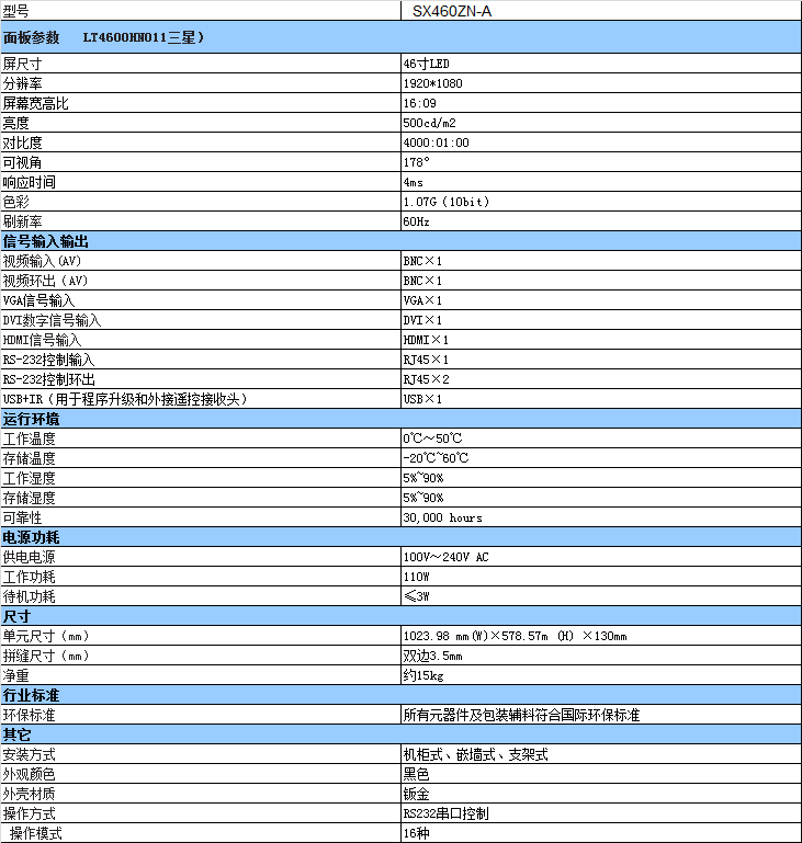 46寸3.5mm液晶拼接屏技術參數: