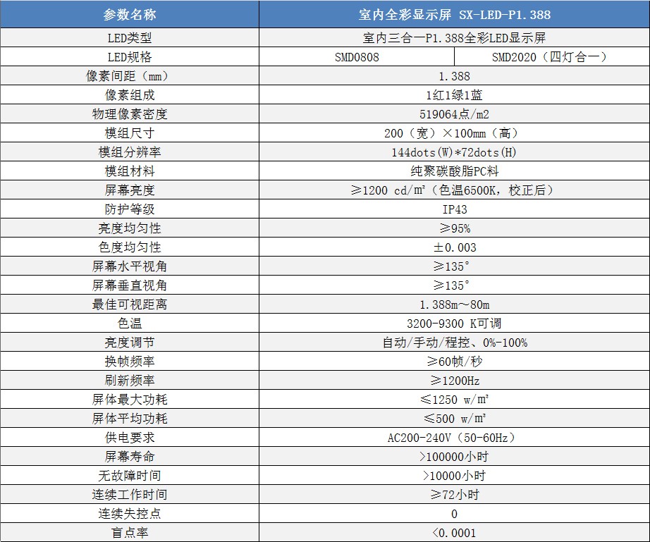 P1.388室內小間距高清全彩LED顯示屏技術參數: